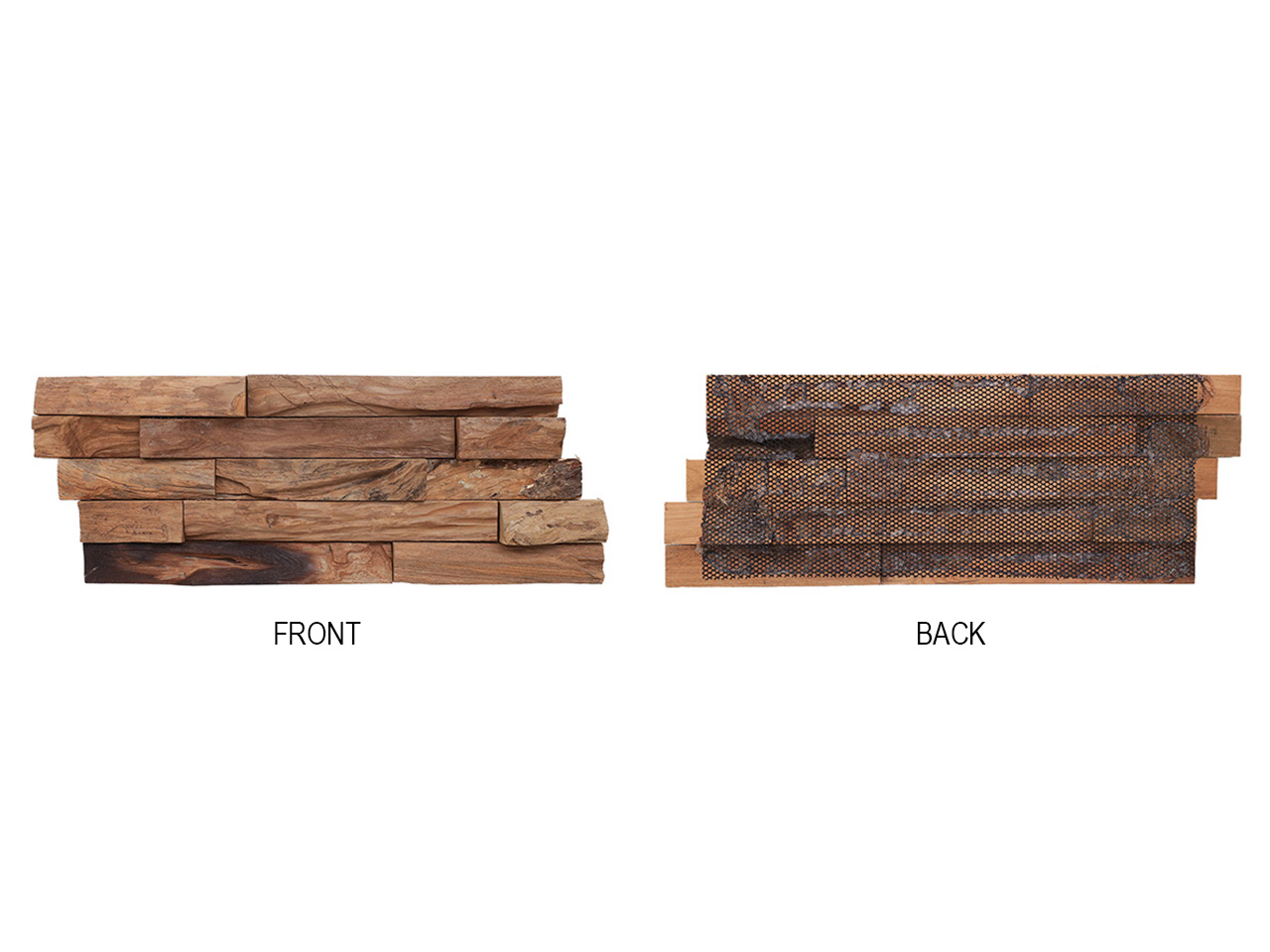 この仕上げ材は、鉄道の枕木などとして使用された100%古材チークを再利用しています。