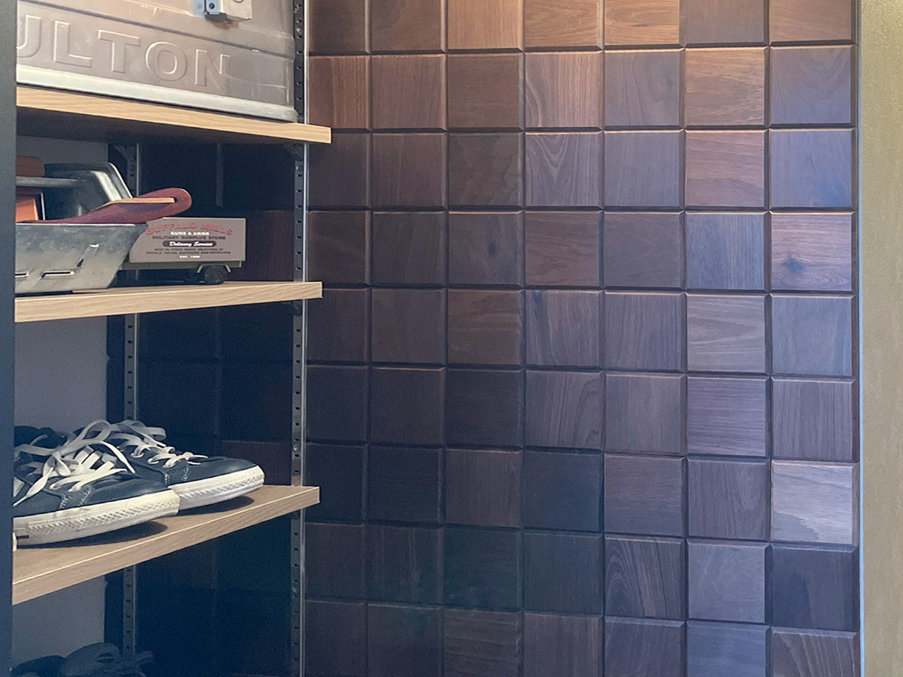 ジュエリーを彷彿とさせる精緻なベベルカット(面取り)と蜜蝋仕上げを施すことで、表面には上質な艶と深みが生まれています。重厚かつ洗練された雰囲気をもたらし、空間のグレードを格段に高めるマテリアルです。