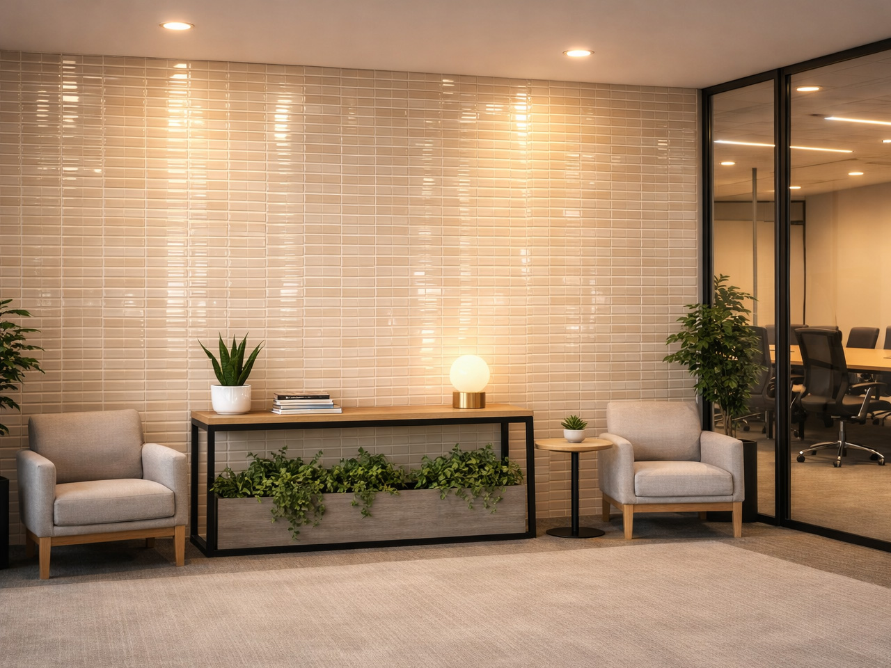 共有スペースにリサイクルタイルを取り入れることで、オフィス内に安らぎと落ち着きをもたらしています。素材の用途を限定しない自由な発想が、企業の柔軟な姿勢を象徴しています。