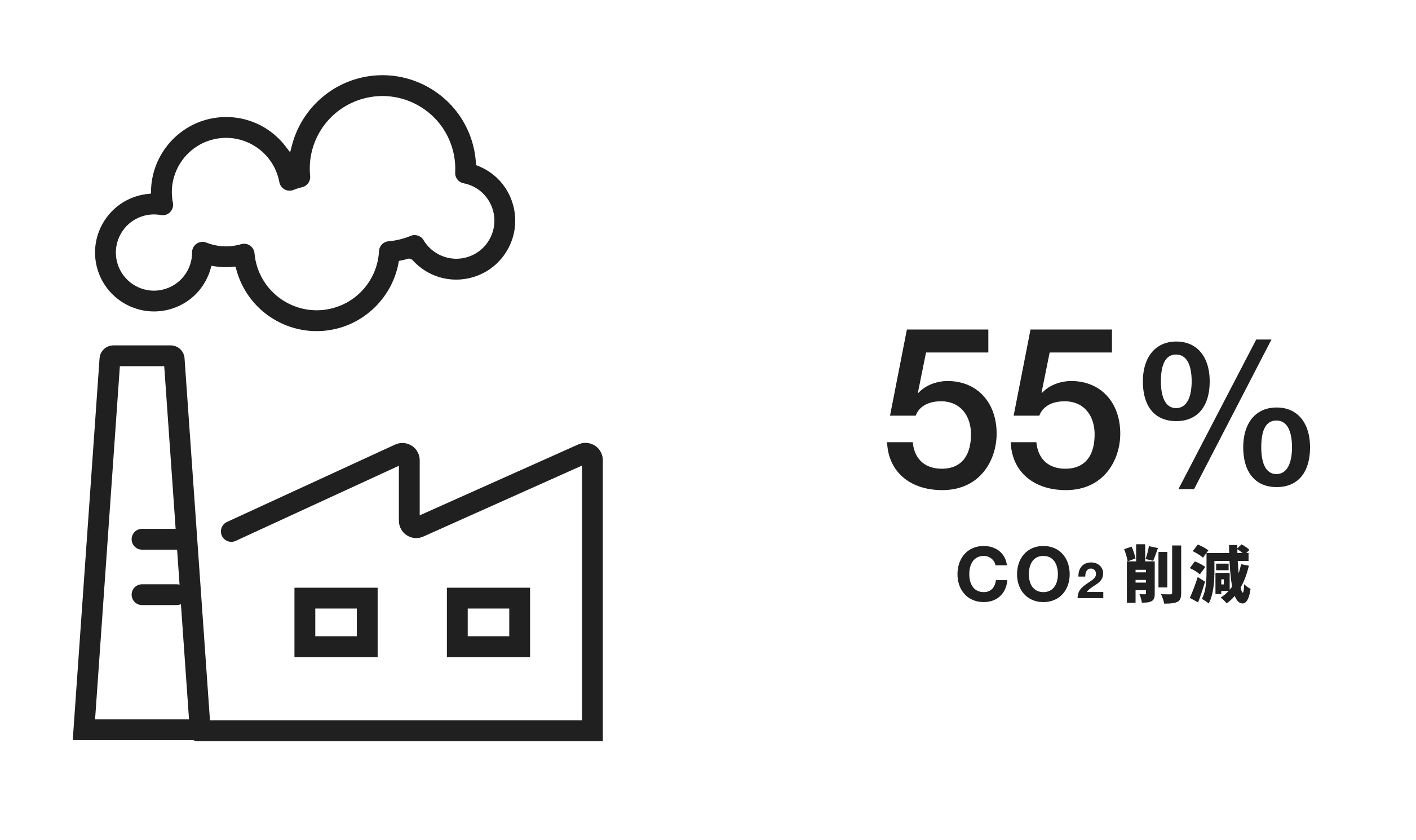ガス窯でタイルを1250℃焼成した場合のCO²排出量に比べ、Uoolの特性上、電気炉による焼成で磁器質タイルを生産することが可能です。CO²排出量を55%削減し、環境負荷を軽減します。